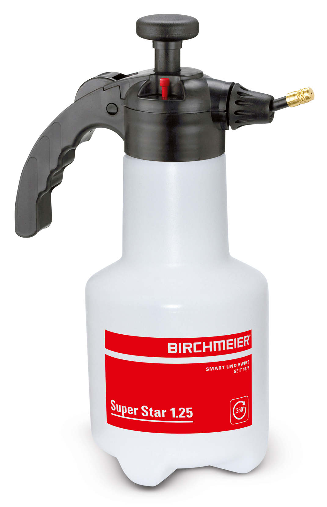 As the inventor of the 360° function, Birchmeier has been equipping the small Foxy Plus sprayer with this feature since 2005. The manufacturer now presents the new Super Star with 360° function. Thanks to this function, the robust sprayer now works in any position, even if it is held at an angle or upside down. The adjustable spray head also makes it easier to use, for example when treating the undersides of leaves. Depending on the application and agent, the user can adjust the brass nozzle to produce anything from a jet to a fine mist.