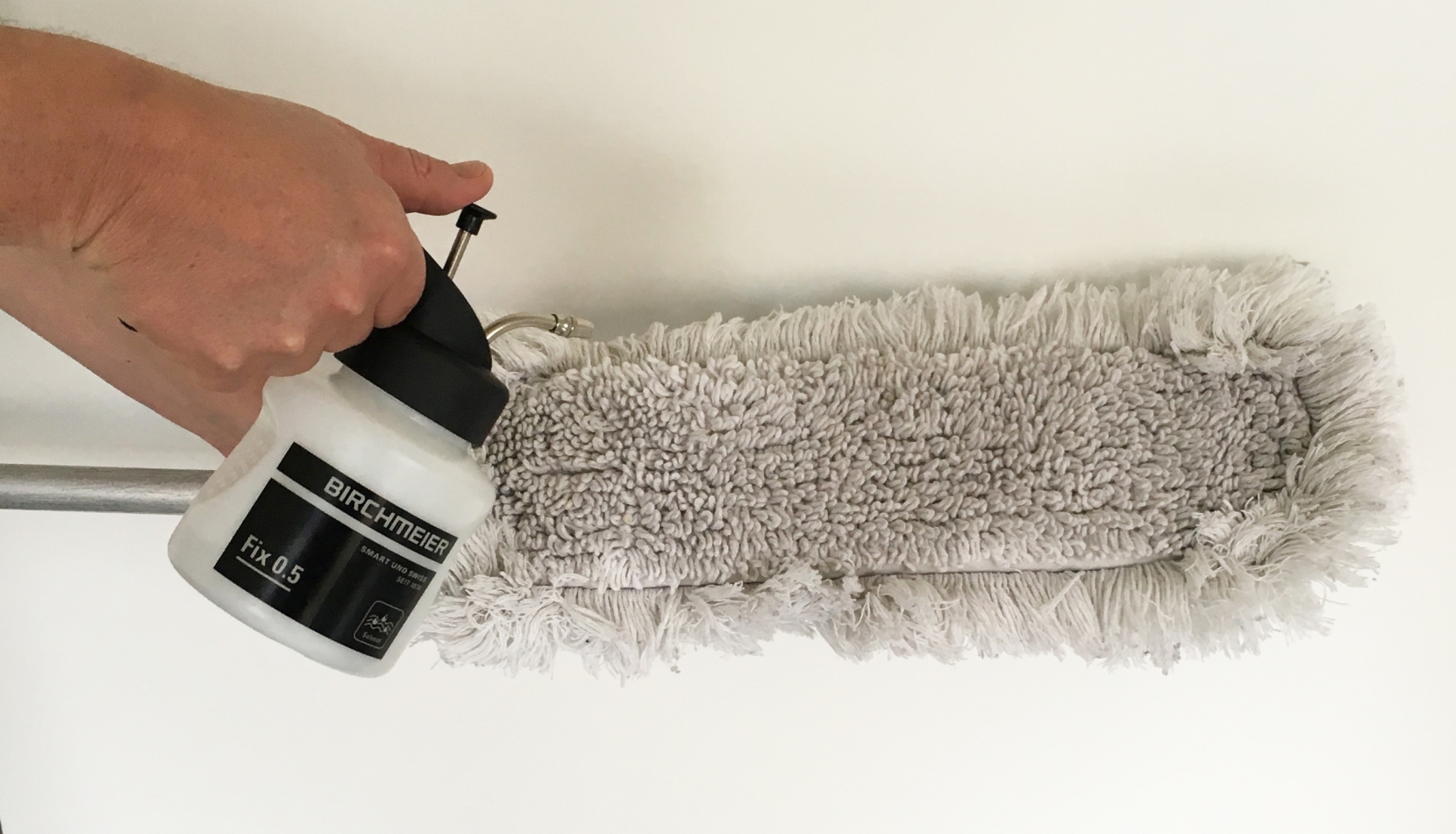 Eine ideale Befeuchtung des Mopps kann mit Hilfe des Kleinsprühgerätes Fix 0.5 erreicht werden. Die leistungsstarke Pumpe mit 12 bar Kolbendruck und die spezielle Düse (ø 0.8 mm) mit Spiraleinsatz erzeugen einen feinen Nebel, welcher tief in die Fasern eindringt. Der robuste Behälter mit übersichtlicher Skalierung und ergonomisch geformten Handgriff passt ideal in jeden Reinigungswagen. Der grosse Durchmesser ermöglicht eine gute Standfestigkeit, sogar wenn der Wagen in Bewegung ist. Das leistungsstarke Handsprühgerät mit chemisch beständigen Viton Dichtungen ist auch in grösserer Form als Maxi 1.0 erhältlich.