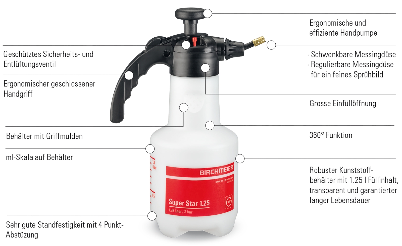 Der Super Star 1.25 von Birchmeier ist das ideale Klein-Sprühgerät für Haus und Garten. Mit seinen 1.25 Litern Füllinhalt ist er leicht und angenehm in der Bedienung. Der Schweizer Hersteller hat nun das Handling noch einmal verbessert: Dank der 360° Funktion sprüht das Gerät in jeder Position, auch schräg oder kopfüber. Die effiziente Druckspeicher-Pumpe erreicht nun 3 bar anstatt der bisherigen 2 bar. Damit hält der Sprühvorgang deutlich länger an. Das Sicherheitsventil, das dank des neuen Zugknopfes nun besser greifbar ist, kann gleichzeitig als Entlüftungshilfe betätigt werden. Die neuen Griffmulden bieten jetzt mehr Komfort beim Öffnen und Schließen des Gerätes. Der Super Star 1.25 ist universell einsetzbar: Zum einen erleichtert der schwenkbare Düsenkopf die Unterblatt-Behandlung von Zimmer- und Gartenpflanzen. Zu anderen kann man an der regulierbaren Messingdüse das Sprühbild von Strahl bis zu einem feinen Sprühnebel einstellen.