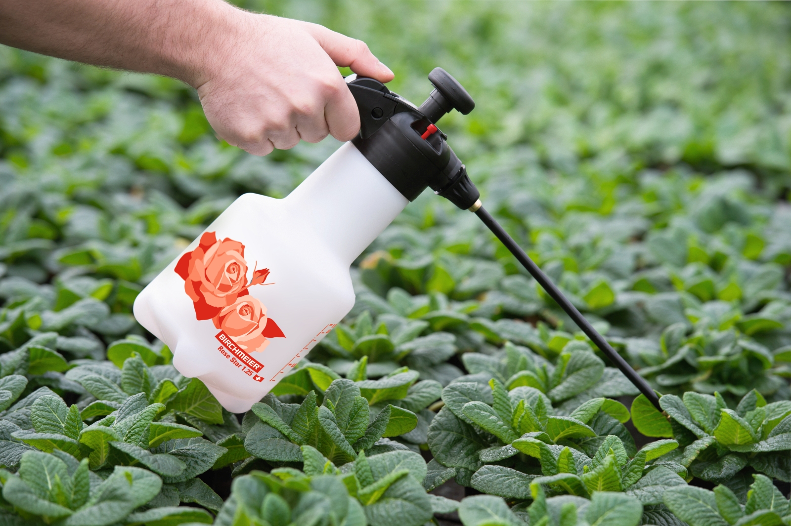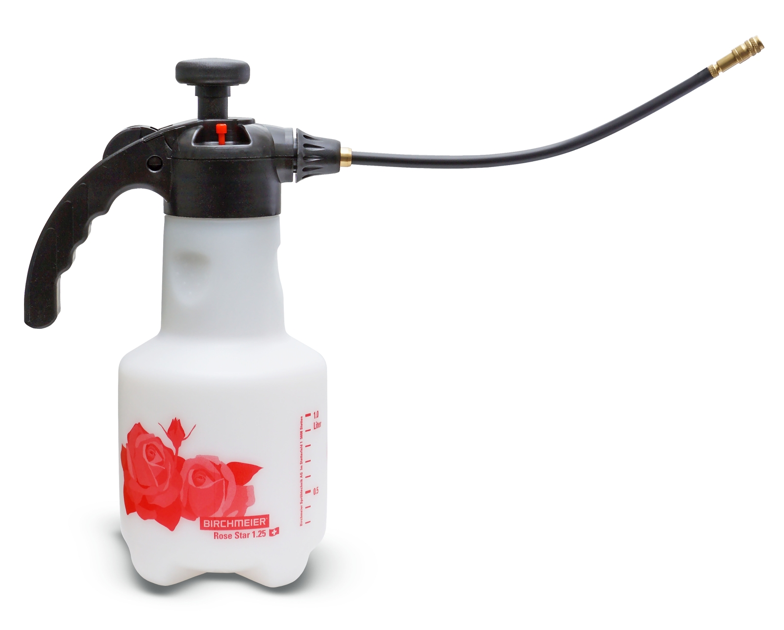 Das 1,25 Liter-Gerät ist mit einer 26 Zentimeter langen, biegbaren Verlängerung ausgestattet, an deren Ende sich die Düse befindet. Das hat den Vorteil, dass der Gärtner nun mühelos die Blattunterseite oder den Befallsherd im Inneren der Pflanze erreicht. An der regulierbaren Messingdüse lässt sich das Sprühbild von Strahl bis zum feinen Sprühnebel einstellen, optimal um die Pflanzen tropfnass zu besprühen. Die 360°-Funktion des Rose Star bietet dem Anwender zusätzlichen Komfort, da das Gerät in jeder Position funktioniert, sogar wenn man es schräg oder kopfüber halten muss. Die effiziente Druckspeicher-Pumpe erreicht bis 3 bar Betriebsdruck, den man mit ein paar wenigen Pumpstössen aufbauen kann.