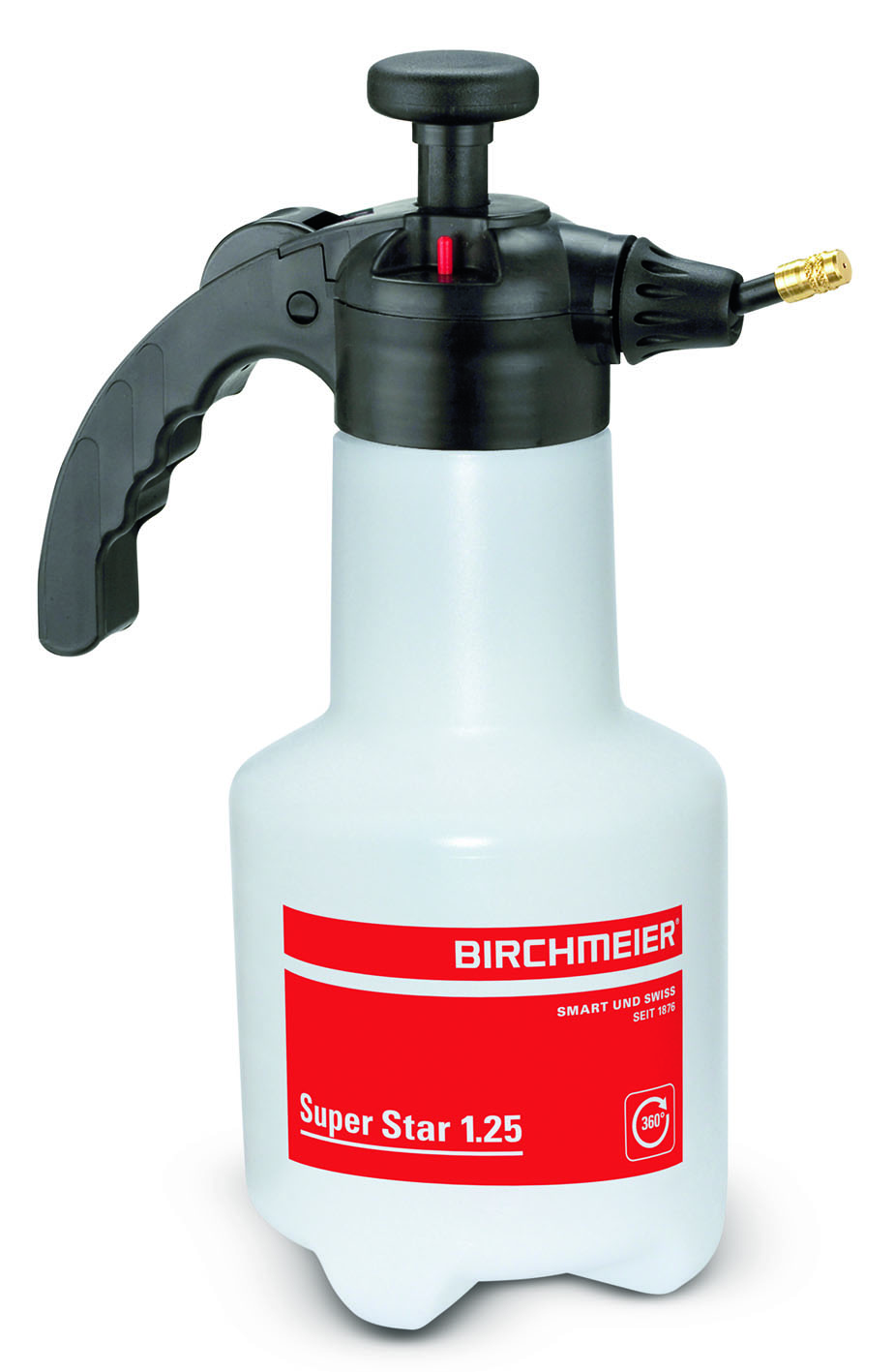 Als Erfinder der 360°-Funktion stattete Birchmeier bereits 2005 das Kleinsprühgerät Foxy Plus mit diesem Feature aus. Zur IPM 2016 präsentiert der Hersteller nun den neuen Super Star mit 360°-Funktion. Damit funktioniert das robuste Sprühgerät jetzt in jeder Position. Sogar wenn man es schräg oder kopfüber halten muss. Der verstellbare Düsenkopf erleichtert zusätzlich die Bedienung, zum Beispiel bei der Unterblatt-Behandlung. Je nach Einsatz und Mittel kann der Anwender an der regulierbaren Messingdüse das Sprühbild von Strahl bis zu einem feinen Sprühnebel einstellen.