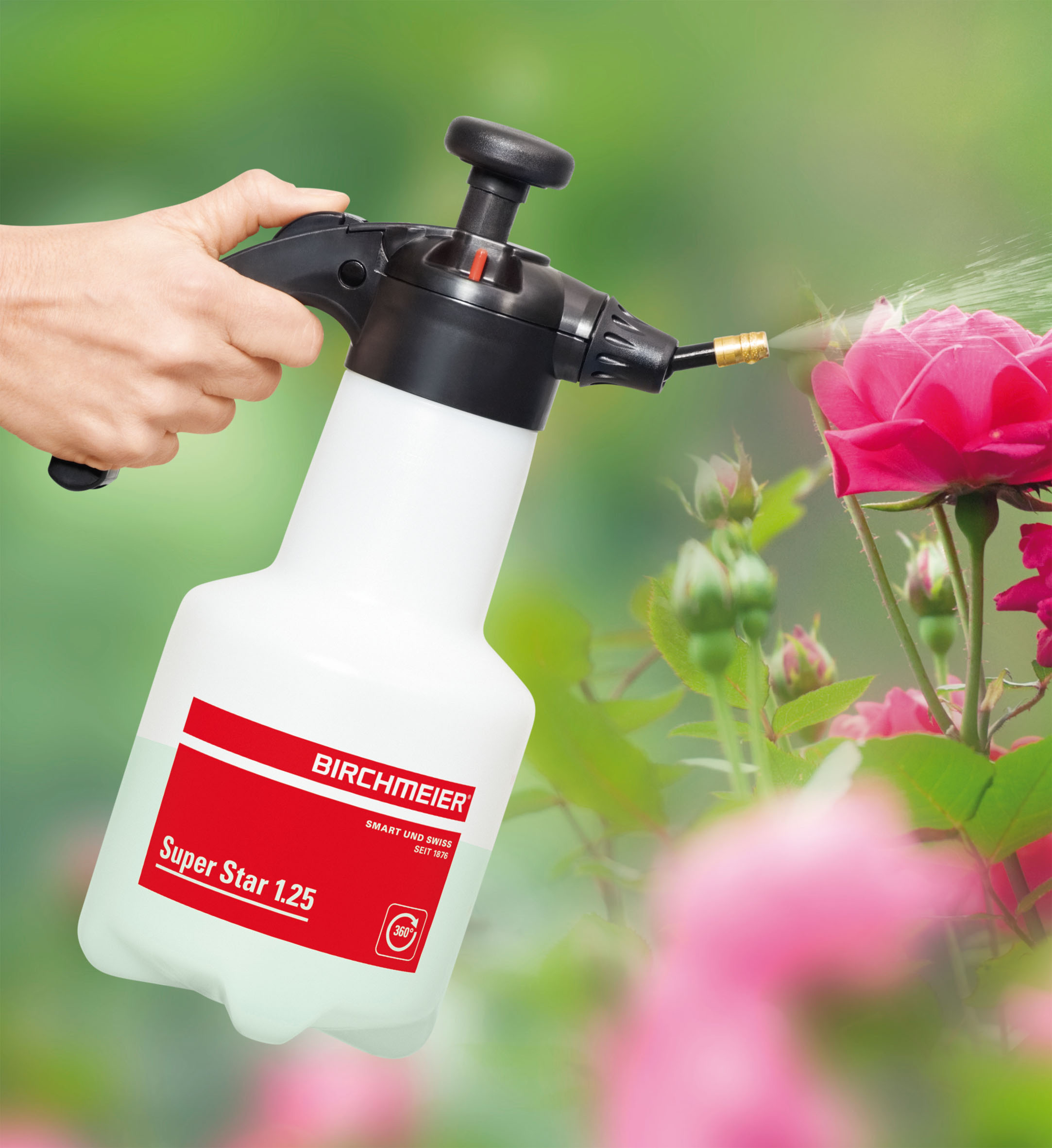 Der Super Star ist mit seinen 1.25 Litern Füllinhalt leicht und angenehm in der Bedienung. Mit dem vielseitigen Zubehör, wie den Verlängerungen in 26 cm, 40 cm oder 80 cm und dem Sprühschirm ist er ideal für viele Anwendungen im Gartenbau.