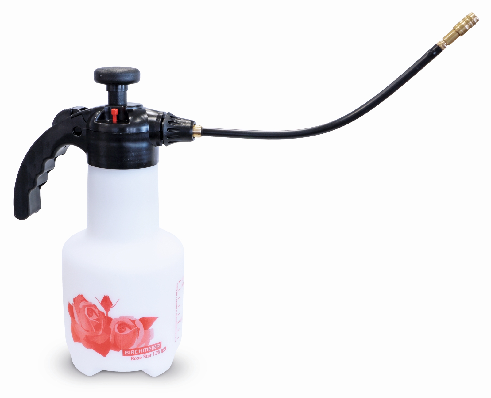 Zum Ausbringen eignet sich zum Beispiel der Rose Star von Birchmeier. Das Sprühgerät ist mit einer 26 Zentimeter langen, biegbaren Verlängerung ausgestattet, an deren Ende sich die Düse befindet. An dieser regulierbaren Messingdüse kann man das Sprühbild von Strahl bis zum feinen Sprühnebel einstellen. Dank der 360°-Funktion sprüht das Gerät in jeder Position, sogar wenn man es schräg oder kopfüber halten muss. Damit erreichen Rosenliebhaber ganz einfach die Blattunterseite oder das Innere der Pflanzen. Die effiziente Druckspeicher-Pumpe erreicht bis 3 bar Betriebsdruck, den man mit ein paar wenigen Pumpstössen aufbauen kann.