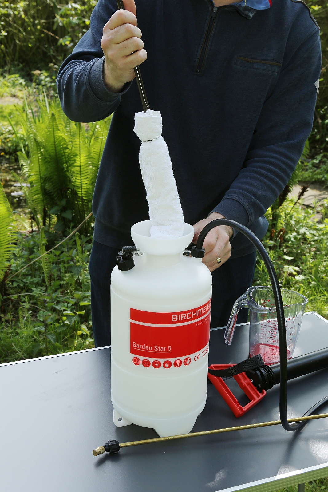 Sollten sich in einem Gerät nach längerer Standzeit angetrocknete Reste einer Spritzbrühe befinden, reinigt man den Behälter am besten mit einem nassen, fusselfreien Baumwolltuch, dazu Aktivkohle aus dem Fachhandel geben und alles über Nacht einwirken lassen. Die Kohle neutralisiert die chemischen Wirkstoffe.