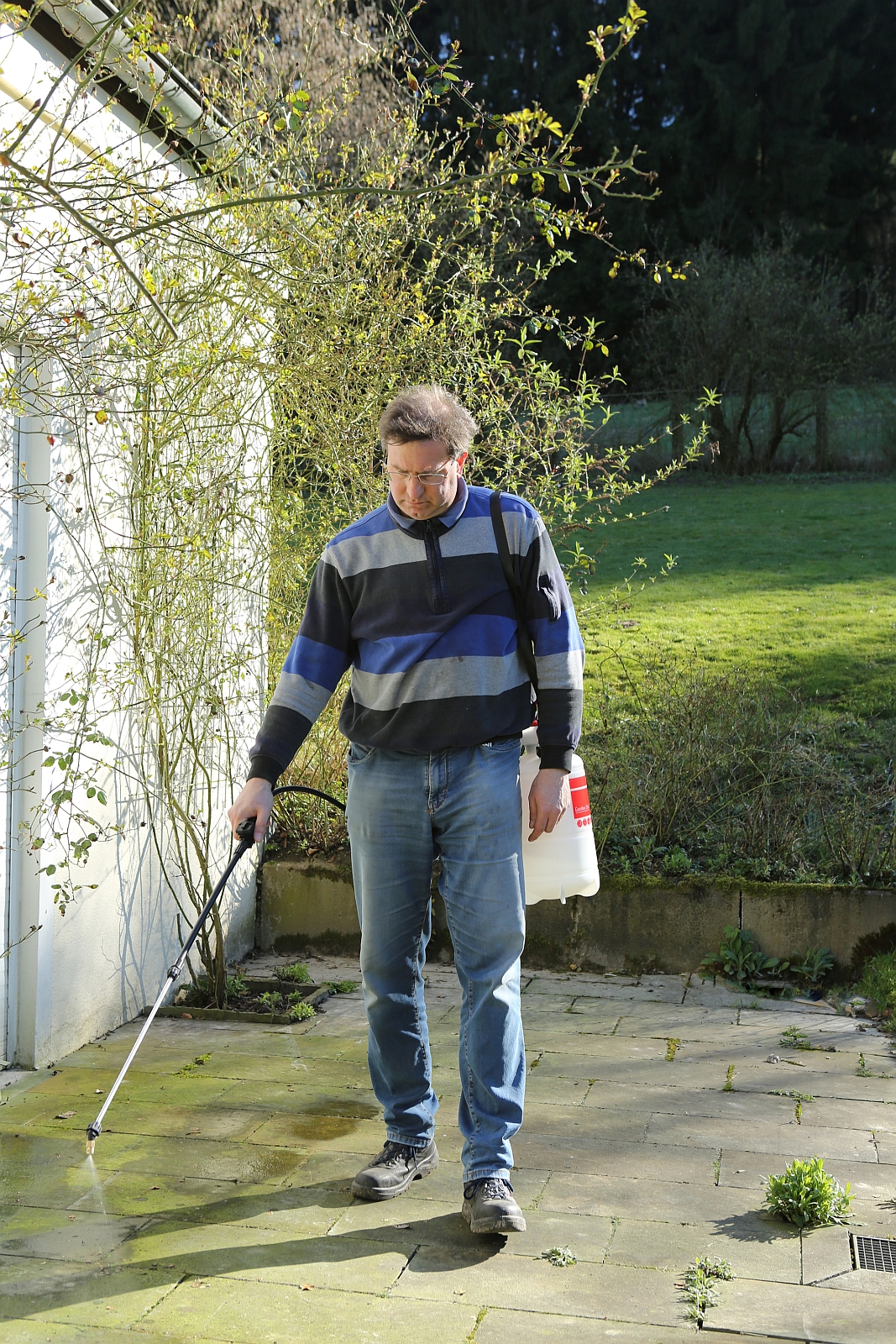 Auf Wegen und Terrassen sind Grünbeläge nicht nur hässlich, sondern können bei Nässe zur waschechten Rutschbahn werden. Sprühlanzen ermöglichen die Arbeit in aufrechter Position und einen Spritzmittelaustritt dicht über dem Boden. Das verhindert eine unerwünschte Abdrift.