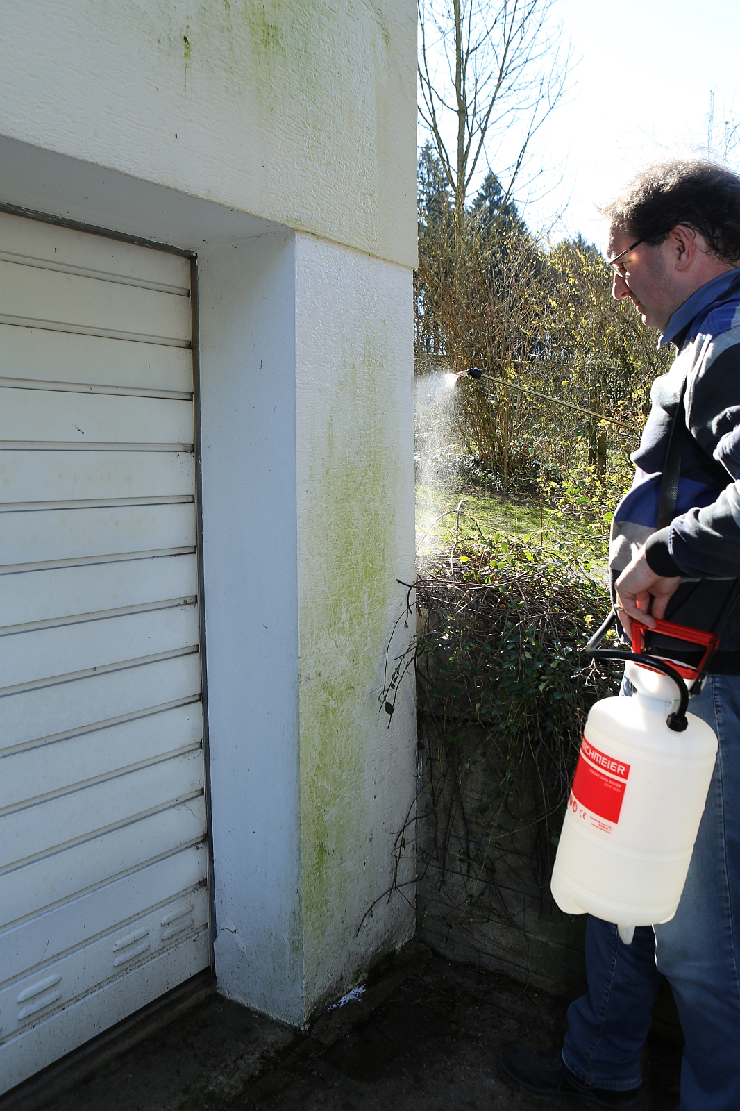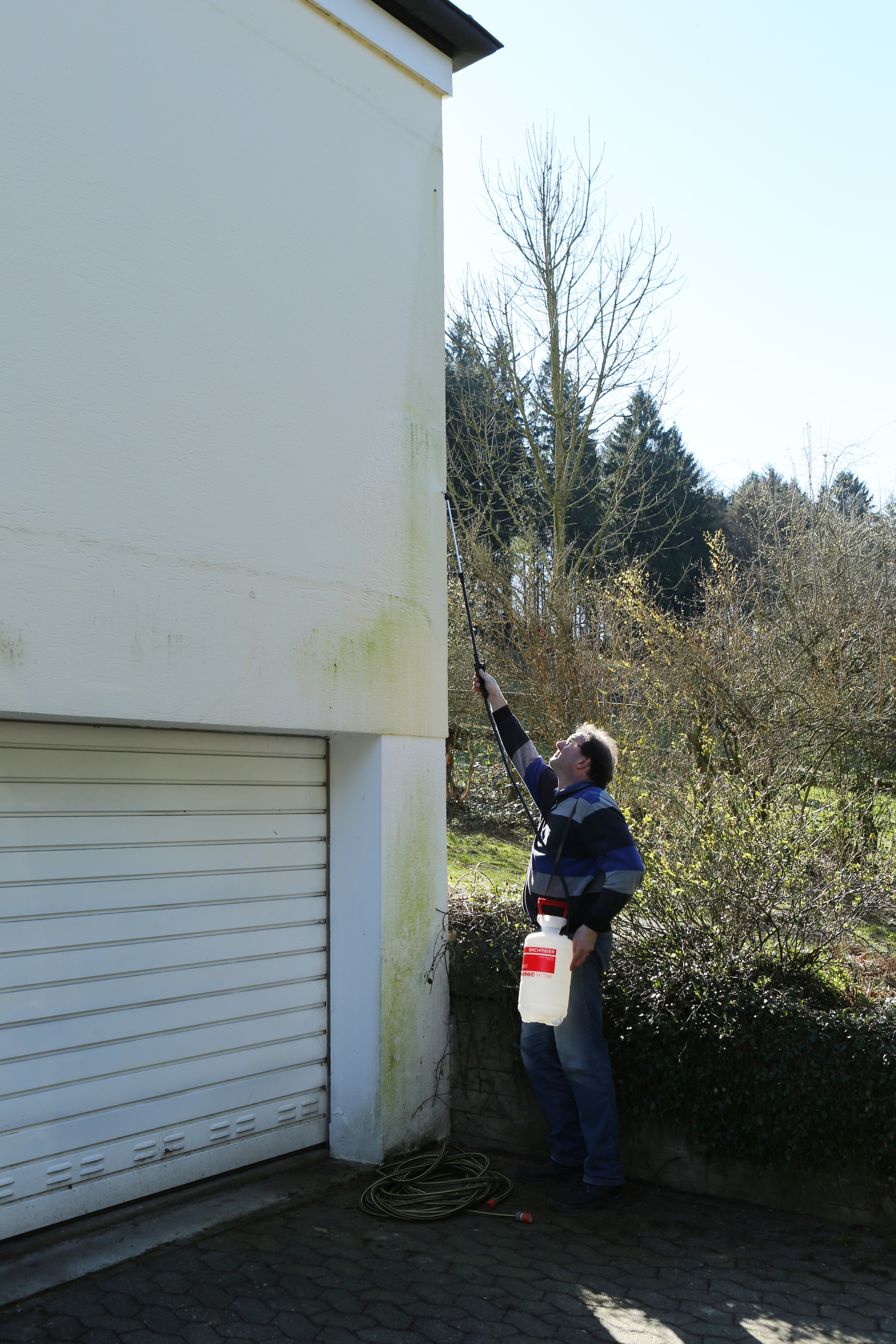 Senkrechte Flächen wie verschmutzte Fassaden spritzt man von unten nach oben. So sieht man genau, wo man noch nicht war und es läuft kein Schmutzwasser in den noch trockenen Wandbereich, wo es womöglich weitere Flecken verursacht. Um sich selbst vor dem Spritzmittel zu schützen, immer mit dem Wind im Rücken sprühen.